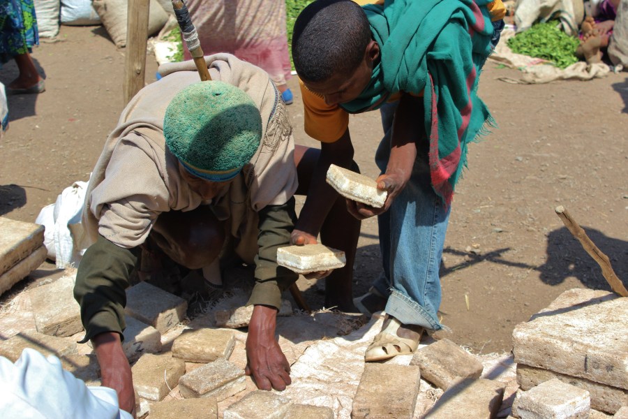 This salt is extracted from the Danekil Depression in northern Ethiopia. The blocks are transported by camel caravan to a town near there, then by truck, mule, donkey, and human carriers to other places – like this market.