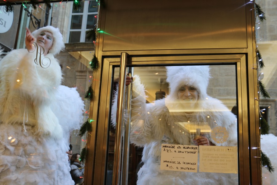 A kind of Jack Frost draws with her finger on the shop window